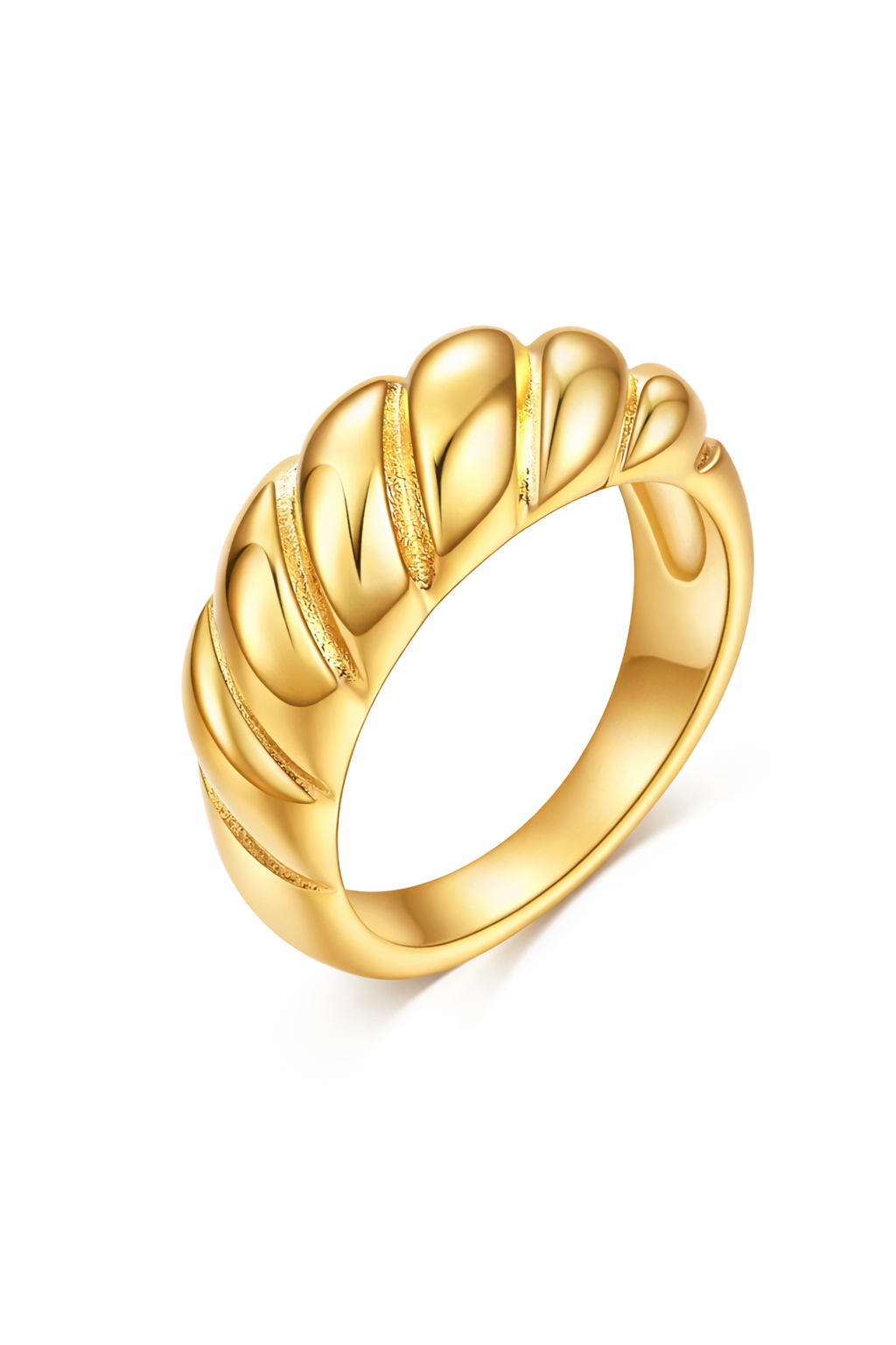 The Elara Ring features softly contoured ridges with a polished, high-shine finish that reflects light beautifully. Crafted from 18kt gold-plated stainless steel, it’s made to feel luxurious yet effortless — the kind of piece you never take off.